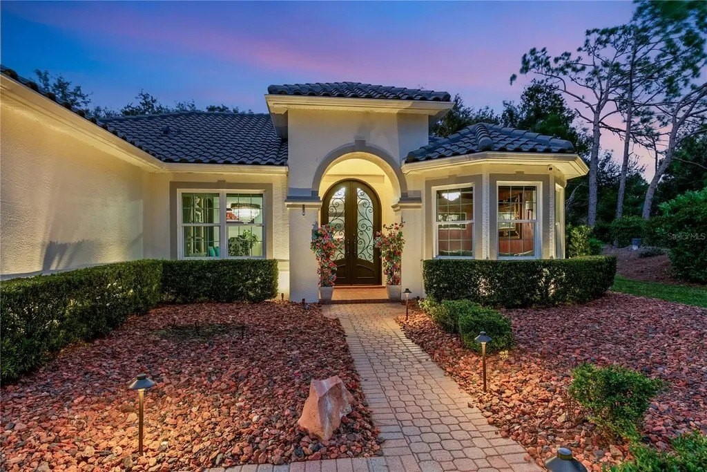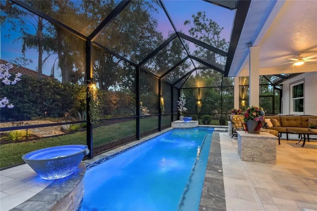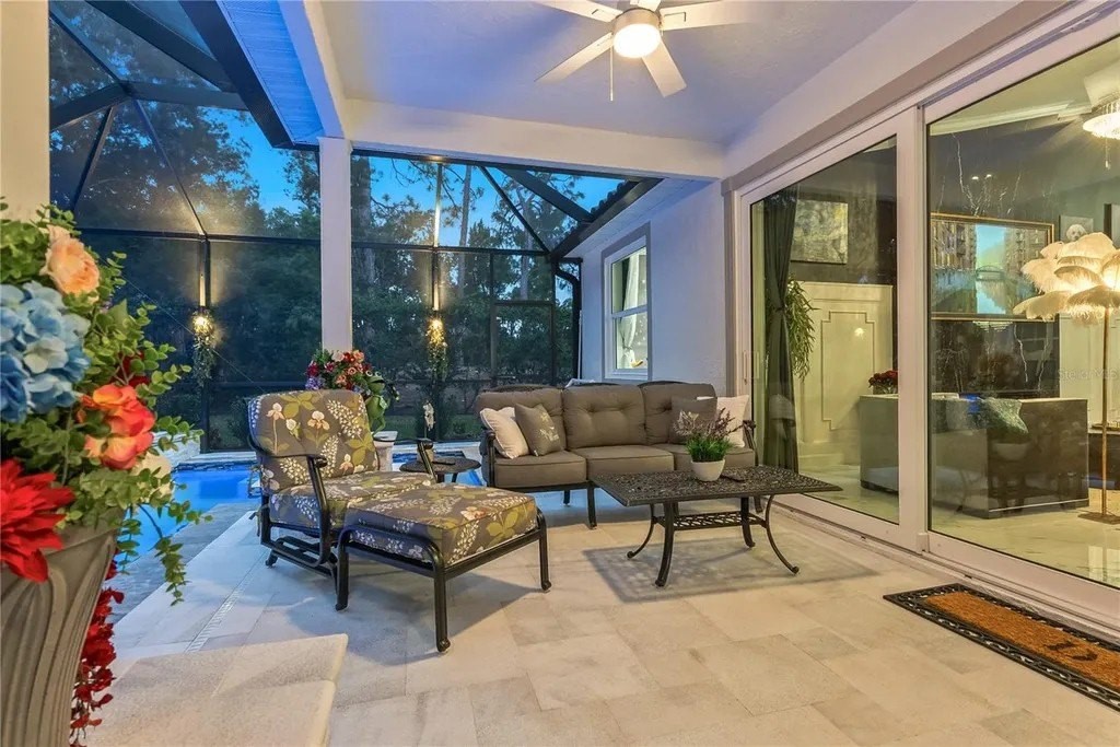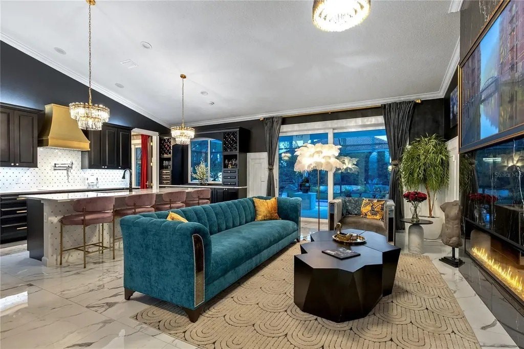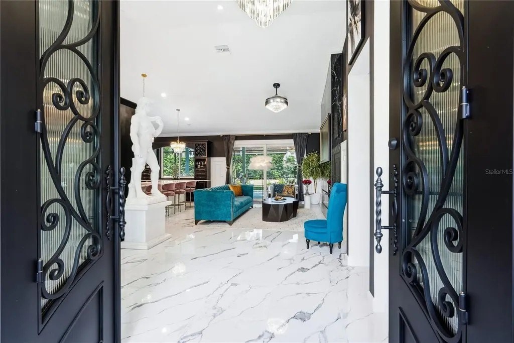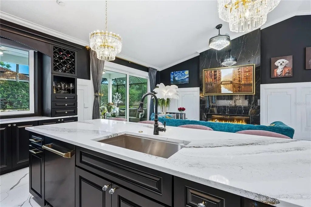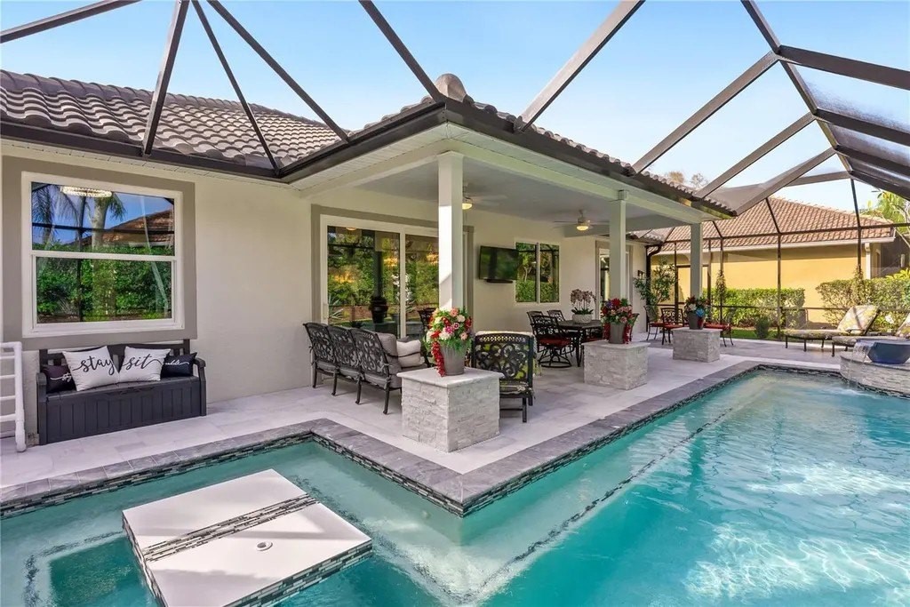 Extraordinary designer pool home showcasing over $750,000 in upgrades, this 2 bedroom, 2 bath residence offers 1,675 sq ft of impeccably curated living space where every detail has been thoughtfully selected from floor to ceiling. Truly a “must-see” smart home, blending elegance, technology, and comfort. From the moment you arrive, you're greeted by designer iron arched front doors, lush tropical landscaping with stone accents and elegant lighting, and impact-rated windows and doors throughout. Inside, 24” x 48” porcelain tile floors, vaulted ceilings, wood-trimmed entryways, 8' solid-core doors, crown molding, and 5¼” baseboards set the tone for refined living .The stunning, open-concept kitchen is a showpiece, featuring rich solid wood cabinetry with designer hardware, quartz countertops, a chair-height island, custom tile backsplash extending to the island front, buffet cabinetry, pantry with built-in coffee station and plumbed water line, pot filler, appliance lift, butcher-style stainless sink, soft-close drawers, and stainless steel appliances including a custom brass hood. The great room impresses with a marble-accented TV wall, custom wall detailing, and sliders leading to the lanai. A beautifully crafted built-in highlights the dining area, while the den features a bay-style window with seating and storage plus custom ceiling detail. The primary suite is a private retreat with sliders to the lanai, coffered ceiling, applied wall molding with designer wallpaper, customized walk-in closets, and a spa-like bath offering dual quartz vanities, decorative mirrors, linen tower, soaking tub with niche, and a luxurious shower with handheld controls compatible with Alexa. A mirrored “secret” door leads directly to the laundry from the primary suite. Outdoor living is exceptional with a rectangular heated saltwater pool, marble tile deck, stone columns, and lush landscaping creating a private resort-style setting. Additional features include spray foam attic insulation, painted garage floors, overhead storage racks, pull-down attic stairs, garage refrigerator, shoe storage cabinet, four TVs (great room, primary bedroom, den, and lanai), safe in primary closet, and a hand-carved statue of David in the entry that conveys with the home. This gem is a “Wow” from floor to ceiling!