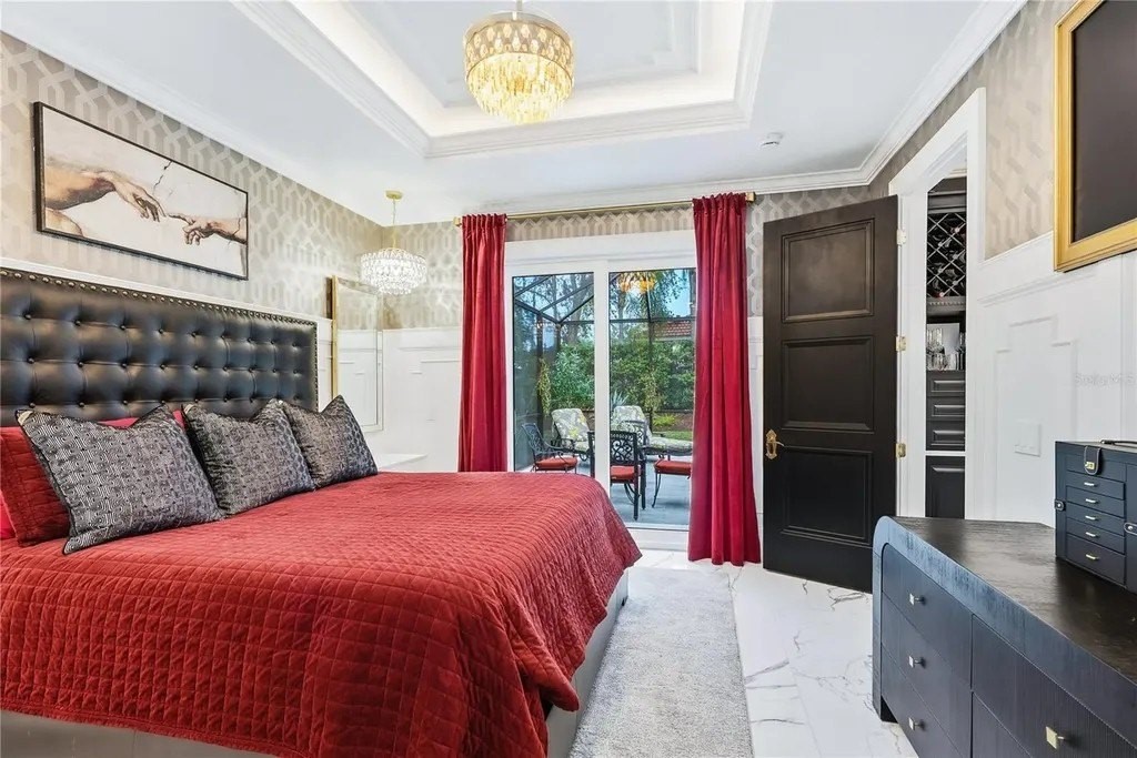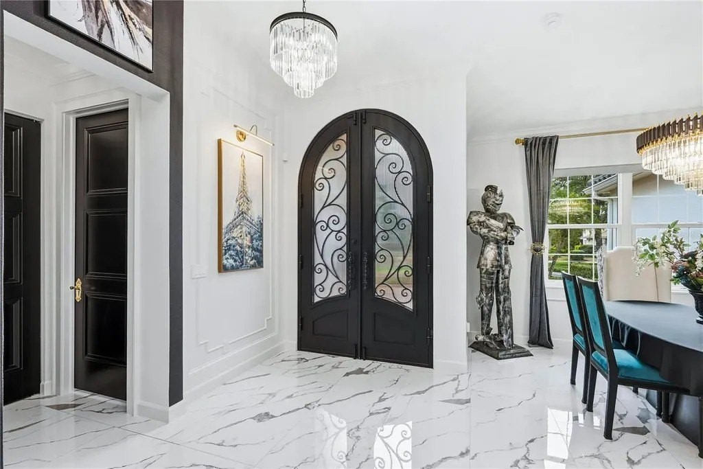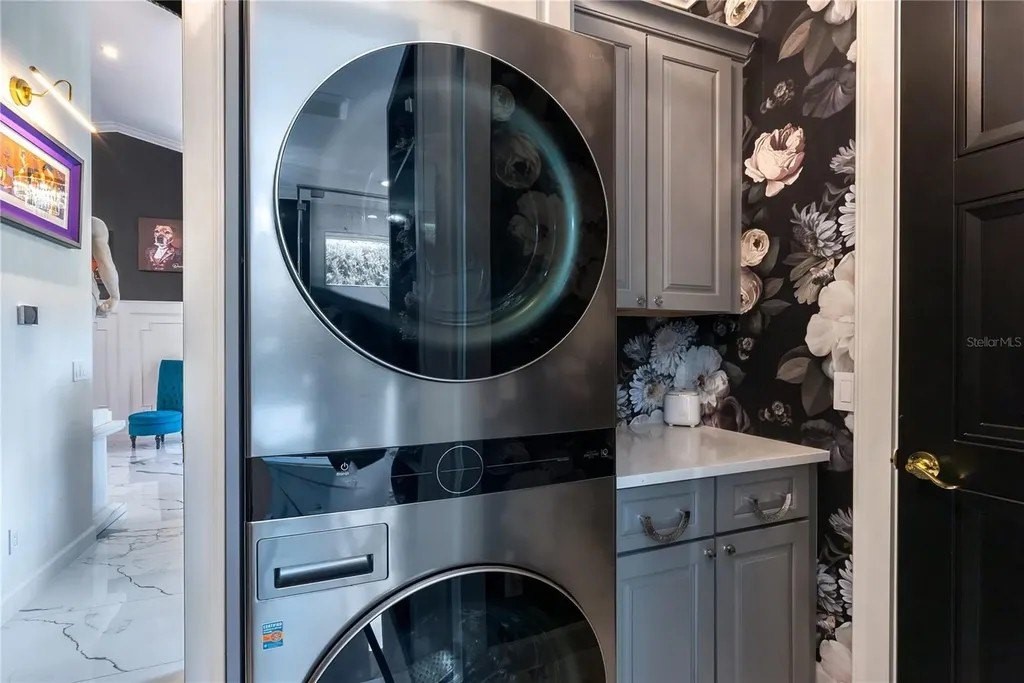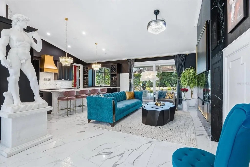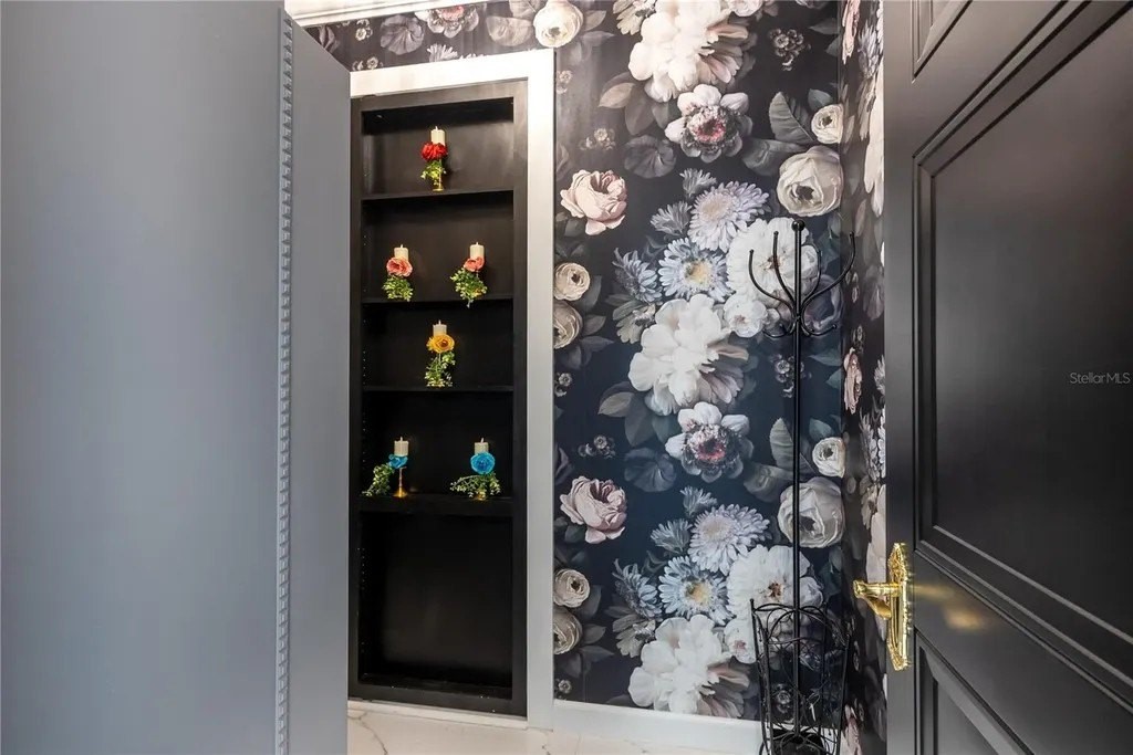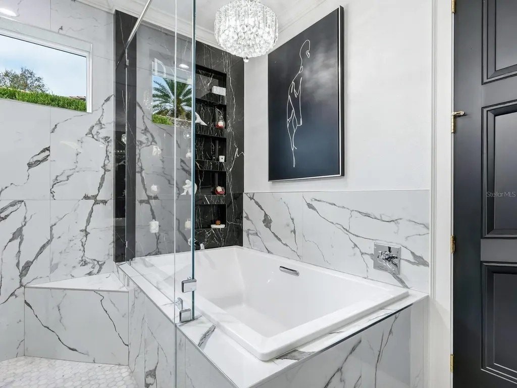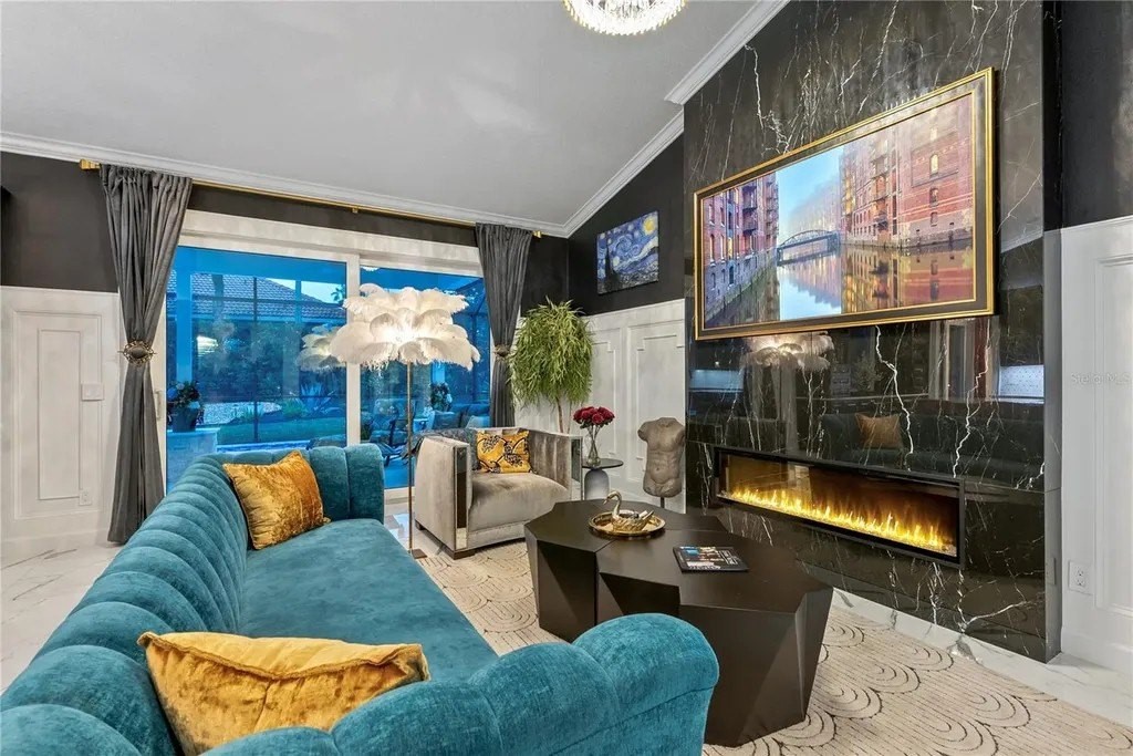 Extraordinary designer pool home showcasing over $750,000 in upgrades, this 2 bedroom, 2 bath residence offers 1,675 sq ft of impeccably curated living space where every detail has been thoughtfully selected from floor to ceiling. Truly a “must-see” smart home, blending elegance, technology, and comfort. From the moment you arrive, you're greeted by designer iron arched front doors, lush tropical landscaping with stone accents and elegant lighting, and impact-rated windows and doors throughout. Inside, 24” x 48” porcelain tile floors, vaulted ceilings, wood-trimmed entryways, 8' solid-core doors, crown molding, and 5¼” baseboards set the tone for refined living .The stunning, open-concept kitchen is a showpiece, featuring rich solid wood cabinetry with designer hardware, quartz countertops, a chair-height island, custom tile backsplash extending to the island front, buffet cabinetry, pantry with built-in coffee station and plumbed water line, pot filler, appliance lift, butcher-style stainless sink, soft-close drawers, and stainless steel appliances including a custom brass hood. The great room impresses with a marble-accented TV wall, custom wall detailing, and sliders leading to the lanai. A beautifully crafted built-in highlights the dining area, while the den features a bay-style window with seating and storage plus custom ceiling detail. The primary suite is a private retreat with sliders to the lanai, coffered ceiling, applied wall molding with designer wallpaper, customized walk-in closets, and a spa-like bath offering dual quartz vanities, decorative mirrors, linen tower, soaking tub with niche, and a luxurious shower with handheld controls compatible with Alexa. A mirrored “secret” door leads directly to the laundry from the primary suite. Outdoor living is exceptional with a rectangular heated saltwater pool, marble tile deck, stone columns, and lush landscaping creating a private resort-style setting. Additional features include spray foam attic insulation, painted garage floors, overhead storage racks, pull-down attic stairs, garage refrigerator, shoe storage cabinet, four TVs (great room, primary bedroom, den, and lanai), safe in primary closet, and a hand-carved statue of David in the entry that conveys with the home. This gem is a “Wow” from floor to ceiling!