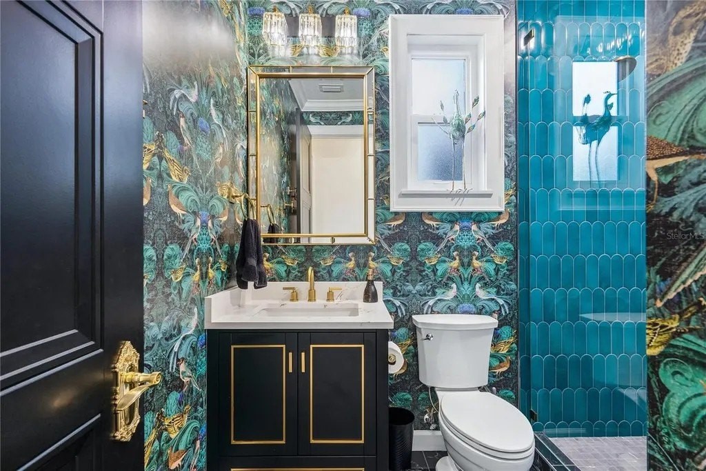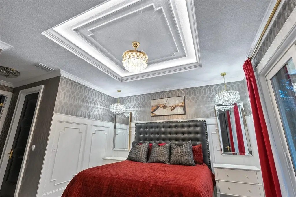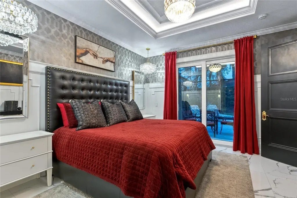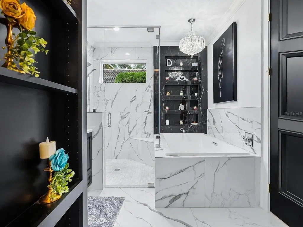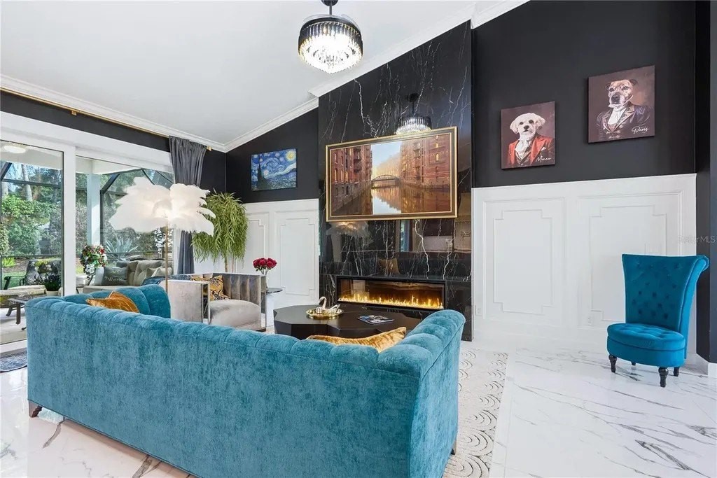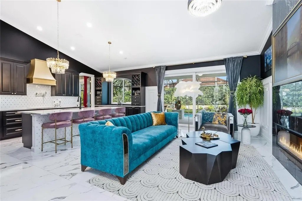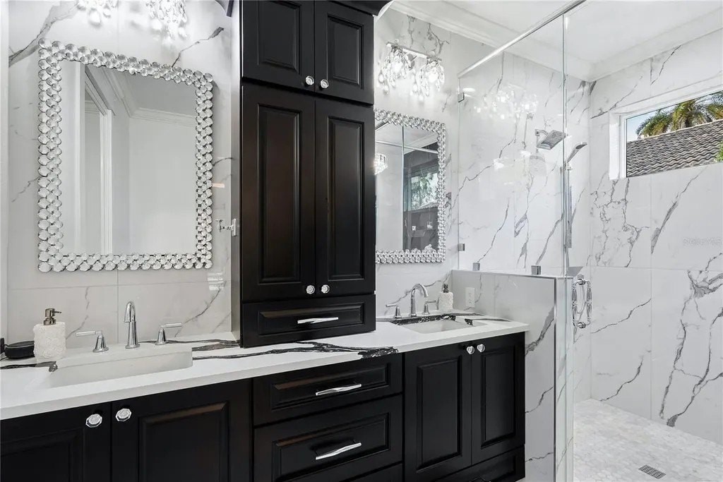 Extraordinary designer pool home showcasing over $750,000 in upgrades, this 2 bedroom, 2 bath residence offers 1,675 sq ft of impeccably curated living space where every detail has been thoughtfully selected from floor to ceiling. Truly a “must-see” smart home, blending elegance, technology, and comfort. From the moment you arrive, you're greeted by designer iron arched front doors, lush tropical landscaping with stone accents and elegant lighting, and impact-rated windows and doors throughout. Inside, 24” x 48” porcelain tile floors, vaulted ceilings, wood-trimmed entryways, 8' solid-core doors, crown molding, and 5¼” baseboards set the tone for refined living .The stunning, open-concept kitchen is a showpiece, featuring rich solid wood cabinetry with designer hardware, quartz countertops, a chair-height island, custom tile backsplash extending to the island front, buffet cabinetry, pantry with built-in coffee station and plumbed water line, pot filler, appliance lift, butcher-style stainless sink, soft-close drawers, and stainless steel appliances including a custom brass hood. The great room impresses with a marble-accented TV wall, custom wall detailing, and sliders leading to the lanai. A beautifully crafted built-in highlights the dining area, while the den features a bay-style window with seating and storage plus custom ceiling detail. The primary suite is a private retreat with sliders to the lanai, coffered ceiling, applied wall molding with designer wallpaper, customized walk-in closets, and a spa-like bath offering dual quartz vanities, decorative mirrors, linen tower, soaking tub with niche, and a luxurious shower with handheld controls compatible with Alexa. A mirrored “secret” door leads directly to the laundry from the primary suite. Outdoor living is exceptional with a rectangular heated saltwater pool, marble tile deck, stone columns, and lush landscaping creating a private resort-style setting. Additional features include spray foam attic insulation, painted garage floors, overhead storage racks, pull-down attic stairs, garage refrigerator, shoe storage cabinet, four TVs (great room, primary bedroom, den, and lanai), safe in primary closet, and a hand-carved statue of David in the entry that conveys with the home. This gem is a “Wow” from floor to ceiling!